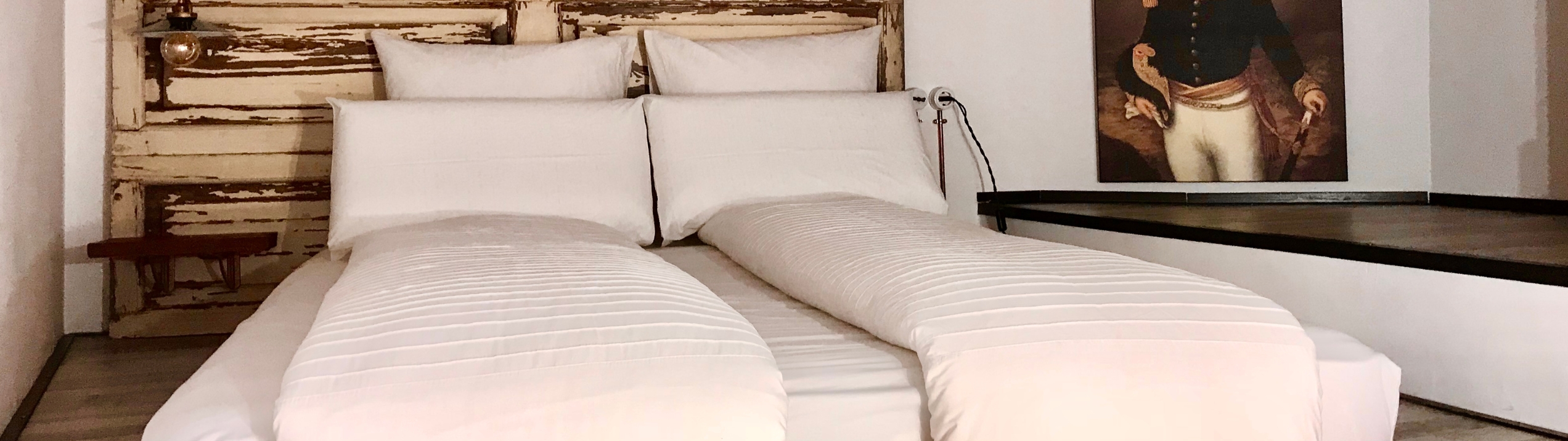 The rest area, as with the others, is designed to fulfill its function without sacrificing design. Here we forget the mural, we have already dreamed of continuing our trip and now it is time to rest on the wonderful viscoelastic mattress that embraces us when we lie down. The headboard, made with doors that were recovered during the renovation of the apartment, reminds us of the past times of the house, times when things were made by hand and were made to last. The work of the 19th century cabinetmaker is still present in the space and although the doors have lost their initial function, their beauty and unique finishes are still as fashionable as ever. No one could have imagined that almost two hundred years after they were finished, travelers from all over Europe would continue to admire, enjoy and respect a job well done and quality well understood and appreciated.